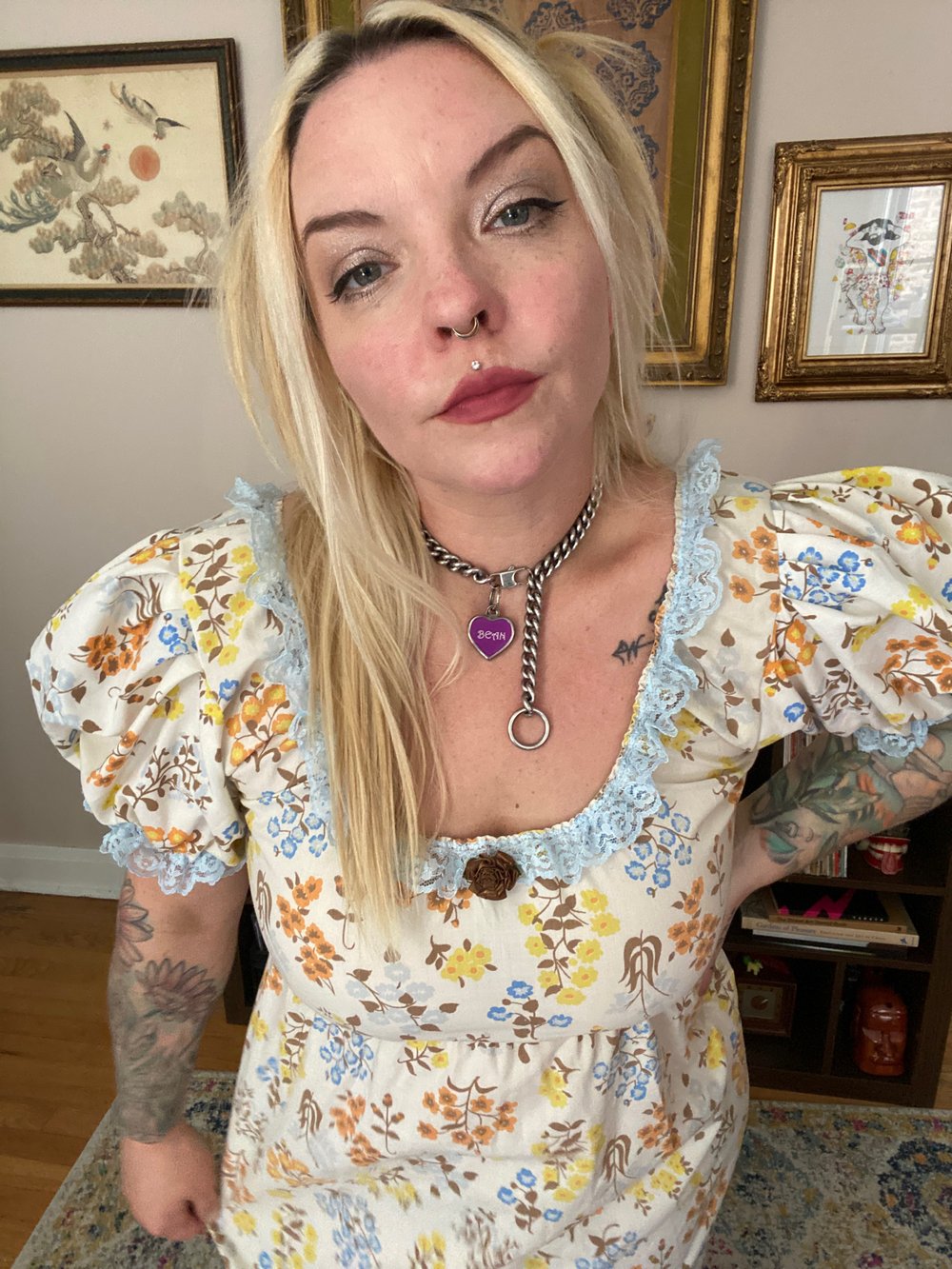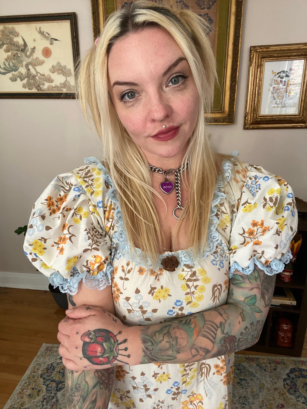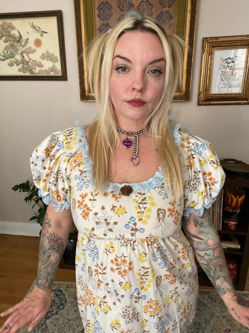 Puff sleeve dress, Made with 70's flower bedsheets upcycled. Vintage lace, and ribbon rose embellishment. Elastic waist, sleeves, and shoulders to adjust to multiple shapes and sizes, should fit a size small/med/lg